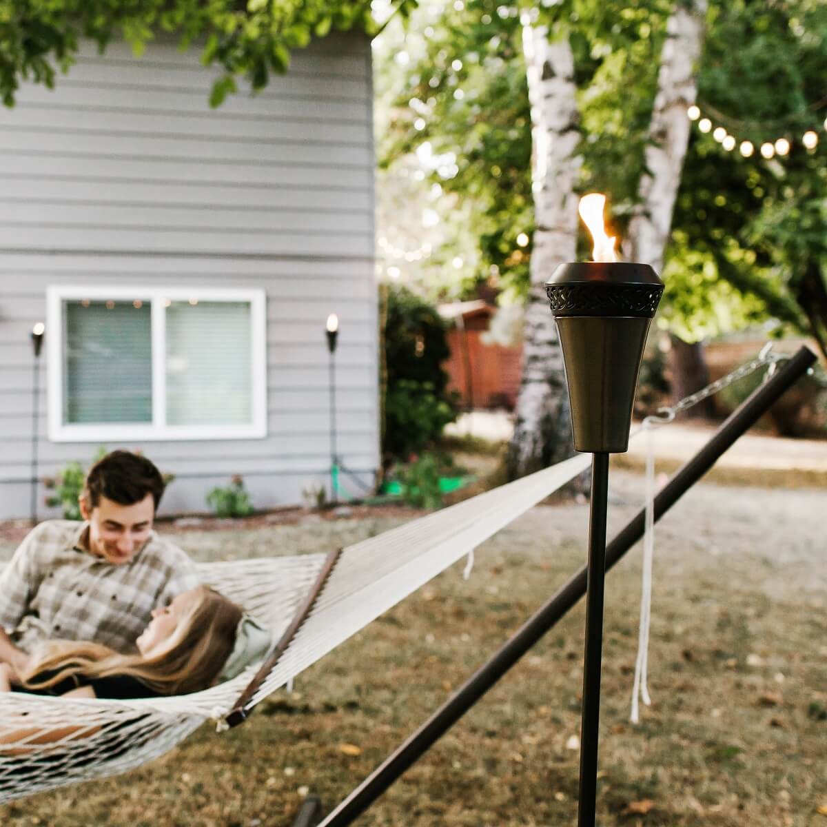 If you spend as much time living and entertaining outdoors as indoors, then adding the ambiance of natural flame lighting with the Island King® Large Flame Torch to your outdoor living room will make your gatherings even more enjoyable. The Island King® Torch features a unique design that results in a flame that’s five times larger than traditional torches. The uniquely designed torch bowl keeps the flame burning big and bright, even in the wind. It has a weather-resistant gunmetal finish and comes with an easy-to-assemble four-piece pole. With its Twist & Pour™ technology, you simply twist the top to expose the fill hole, pour in your torch fuel and then twist to close, providing quicker refills and less mess. It also comes with an attached magnetic metal snuffer to help extinguish flames and cover the wick when not in use. Each torch stands 66 inches tall. For proven mosquito repellency*, use with TIKI® Brand BiteFighter® Torch Fuel, and enjoy up to 5 hours of burn time with each 16-ounce fill. TIKI® Brand BiteFighter® Torch Fuel sold separately. *Based on studies using CO2-emitting mosquito traps which demonstrated over 50% reduction in captured mosquitoes compared to untreated controls. Use as directed. Efficacy may be affected by weather conditions, torch placement, and individual physical factors.